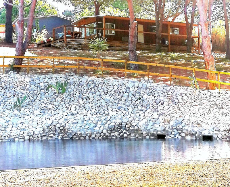 Varanda com vista para a piscina com mesa e cadeiras e zona de descanso.